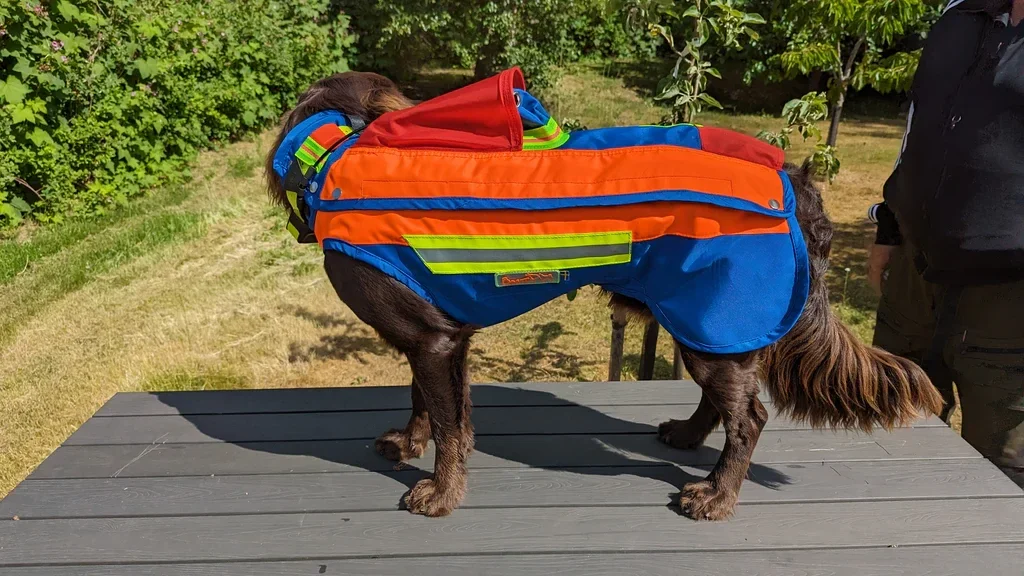De kraag heeft lussen voor een GPS-unit en een trackingzak op de rug die aan de binnenzijde van het vest opent.